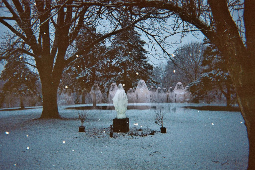 Our Lady of The Snow was one of five narrative features chosen by the Sundance Catalyst Program. During my presentation at Park City, I discussed my vision for the production to a theater full of investors and production companies. Central to my talk was my intent to not rely on CGI or AI for the ghostly effects but to create them on set so the actors had real stimuli to respond to. Both James Wan and Guy Maddin use this technique presently, and I love their films. Obviously a lot of classic ghost thrillers like The Shining, Frankenstein, The Exorcist, and Don’t Look Now relied on these techniques as well.